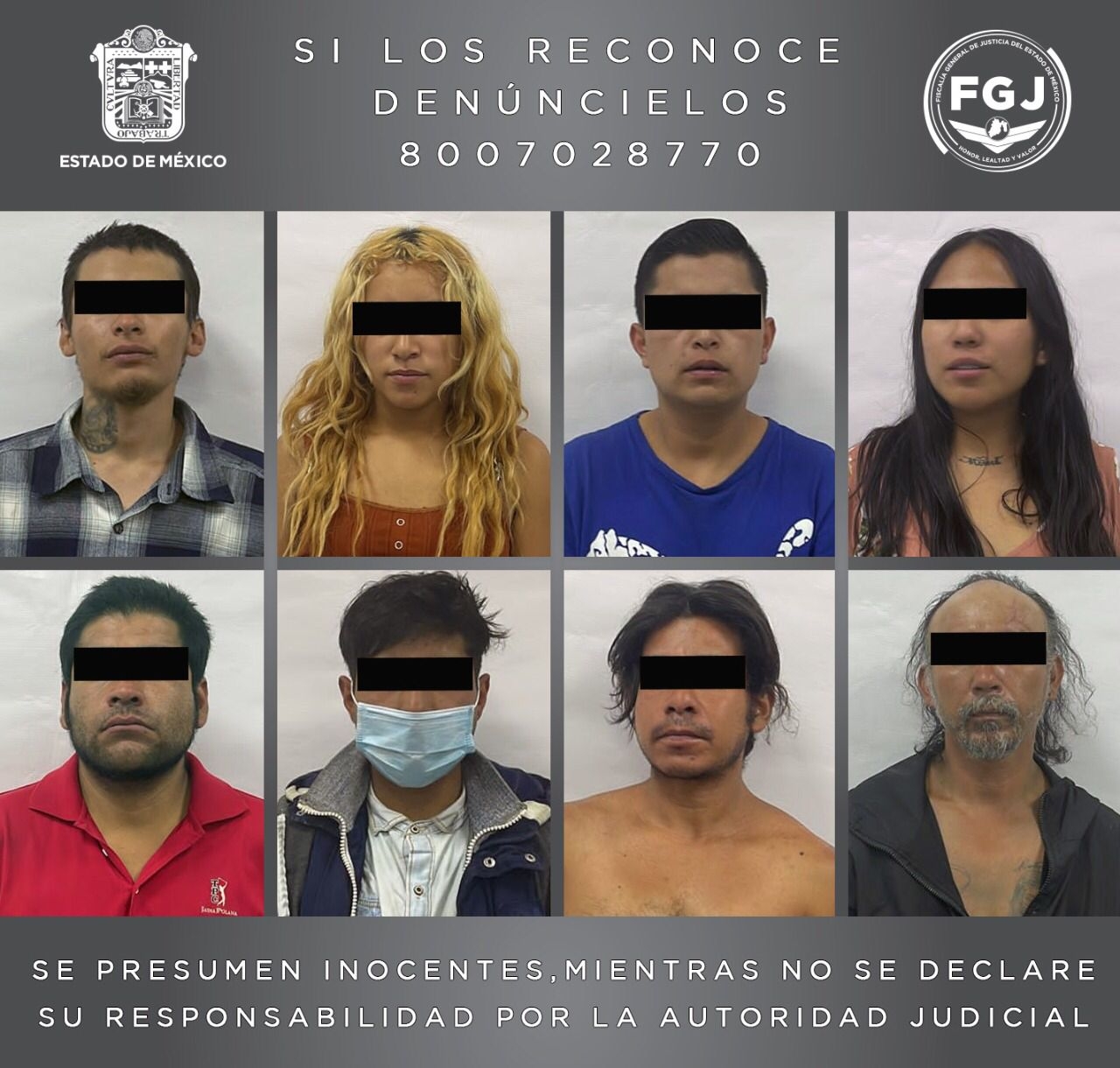 El mandamiento judicial fue otorgado, por lo que agentes de la FGJEM, quienes contaron con el apoyo de elementos de la SS y de la policía municipal de Nicolás Romero se trasladaron al sitio, en donde fueron detenidos Ana Isabel “N” de 23 años, Óscar Antonino “N” de 21 años, José Antonio “N” de 20 años, Julio César “N” de 29 años, Daniel “N” de 32 años, José Óscar “N” de 41 años, Marilyn Bridget “N” de 19 años y Francisco Javier “N” de 19 años.