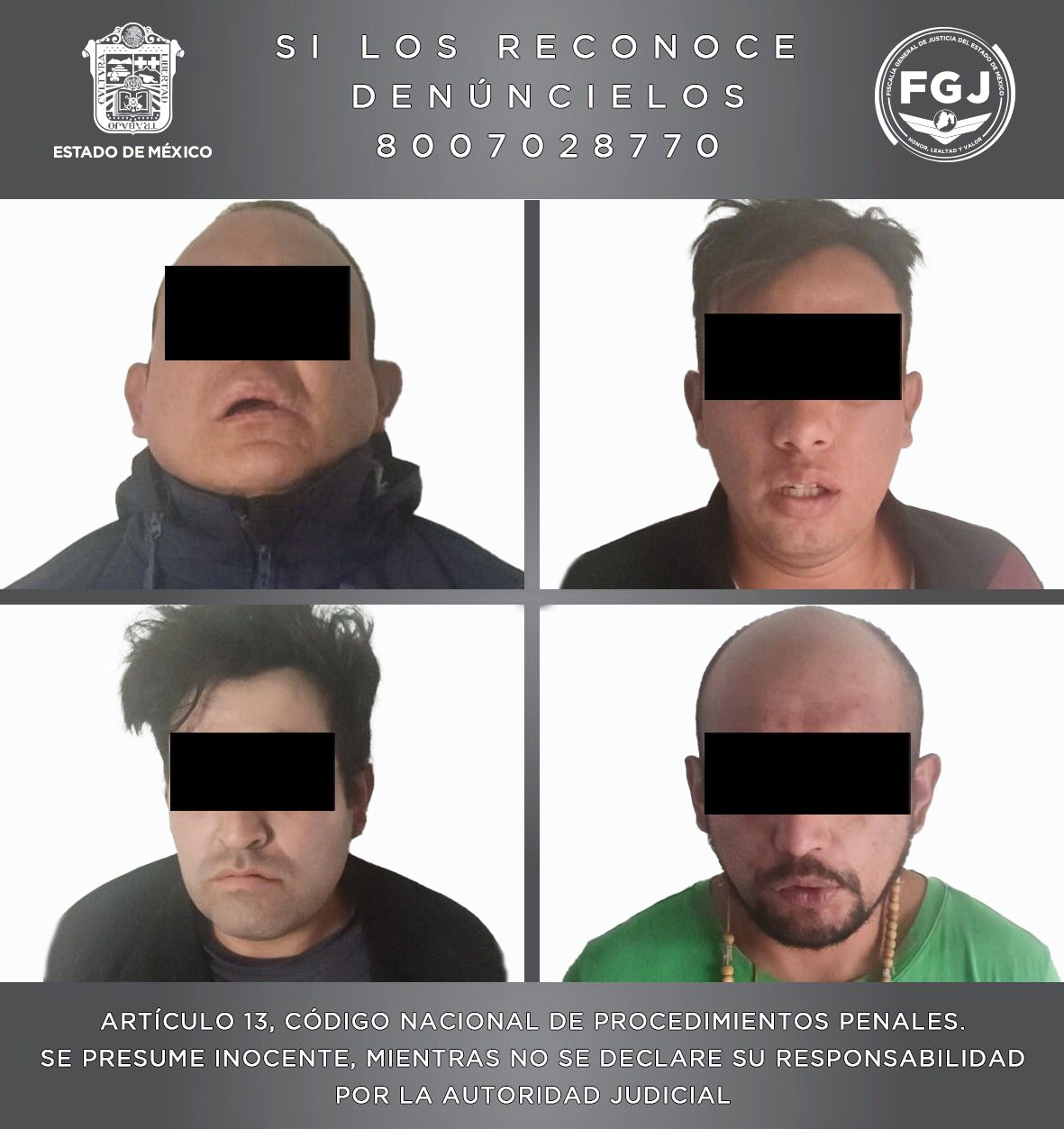 La Fiscalía General de Justicia estatal pone a disposición de la ciudadanía el correo electrónico [email protected], el número telefónico 800 7028770, o bien, la aplicación FGJEdomex, la cual está disponible de manera gratuita para teléfonos inteligentes de los sistemas iOS y Android, para que denuncie cualquier hecho delictivo