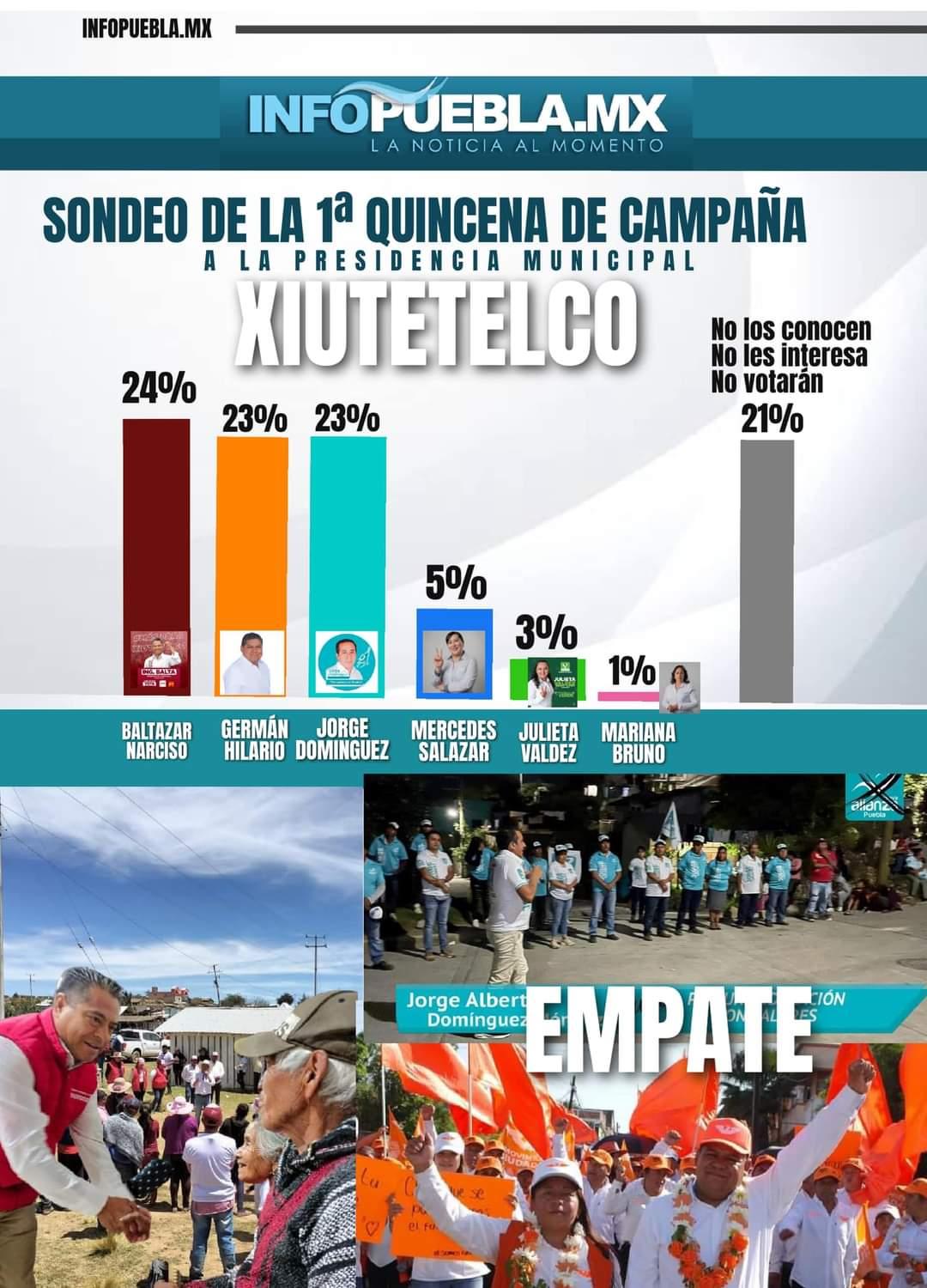 Lo interesante del tema Xiutetelco no solamente es que Baltasar Narciso lleve ventaja para reelegirse, sino que dicho estudio de opinión habría sido pagado por el PAN, cuyo representante, Mercedes Salazar, aparece muy lejos, con solamente el 5 por ciento de la intención de voto: https://desdepuebla.com/2024/02/02/gobierno-de-puebla-invirtio-3-5-mdp-en-obra-educativa-para-xiutetelco/.
