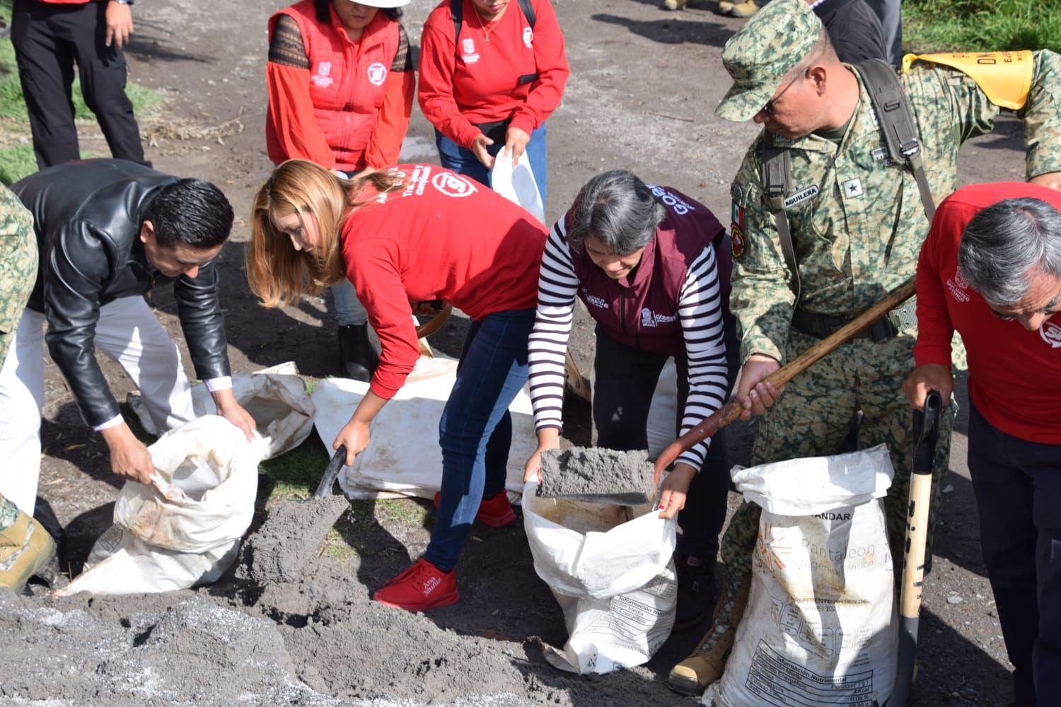 San Mateo Atenco, Méx.- Con el objetivo de estar prevenidos y salvaguardar a los habitantes en esta temporada de lluvias, el gobierno municipal, la Secretaría de la Defensa Nacional y dependencias del gobierno estatal, llevaron a cabo una jornada de trabajo en la que rellenaron mil costales de arena que quedaron disponibles para atender cualquier eventualidad.