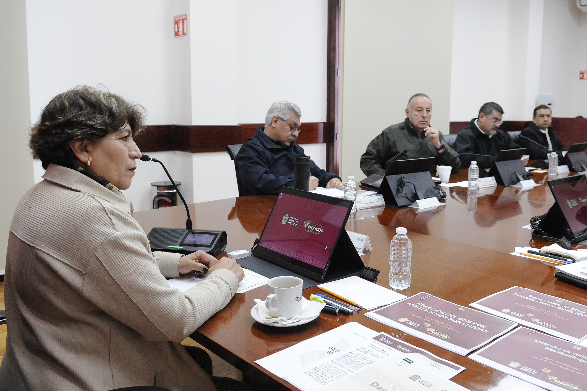 “En la Mesa de Coordinación para la Construcción de la Paz, la Gobernadora del #EstadoDeMéxico, Maestra @delfinagomeza, encabezó la reunión donde se dio seguimiento a temas en materia de seguridad que garantizan la tranquilidad en la vida de las y los mexiquenses. #ElPoderDeServir”, resaltó en su cuenta de X.
