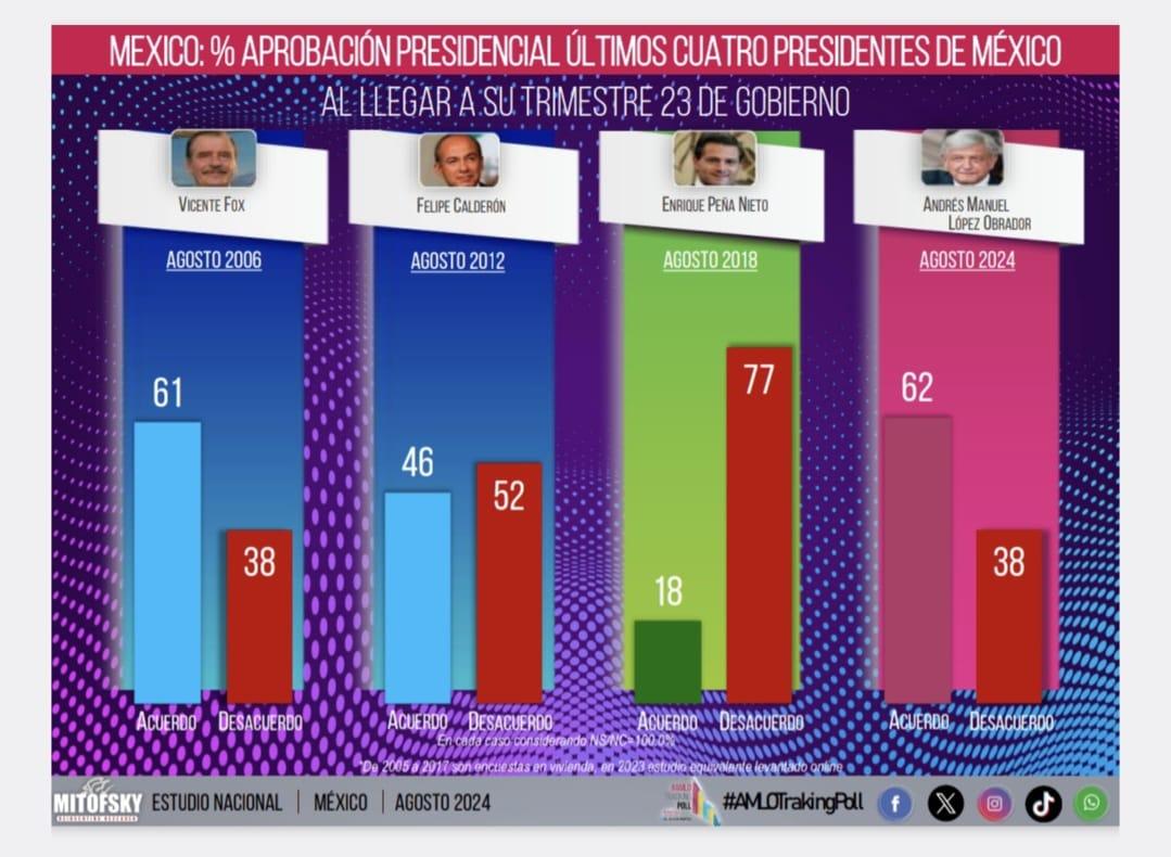 Entre los 4 presidentes de México de este siglo, Andrés Manuel López Obrador llega al mes 69 de su gobierno con la aprobación ciudadana más alta, 62 por ciento, levemente superior a la de Vicente Fox (61%), pero muy por arriba de lo que obtuvieron Felipe Calderón Hinojosa (46%) y Enrique Peña Nieto (18), según Consulta Mitofsky, la empresa demoscópica de Roy Campos.