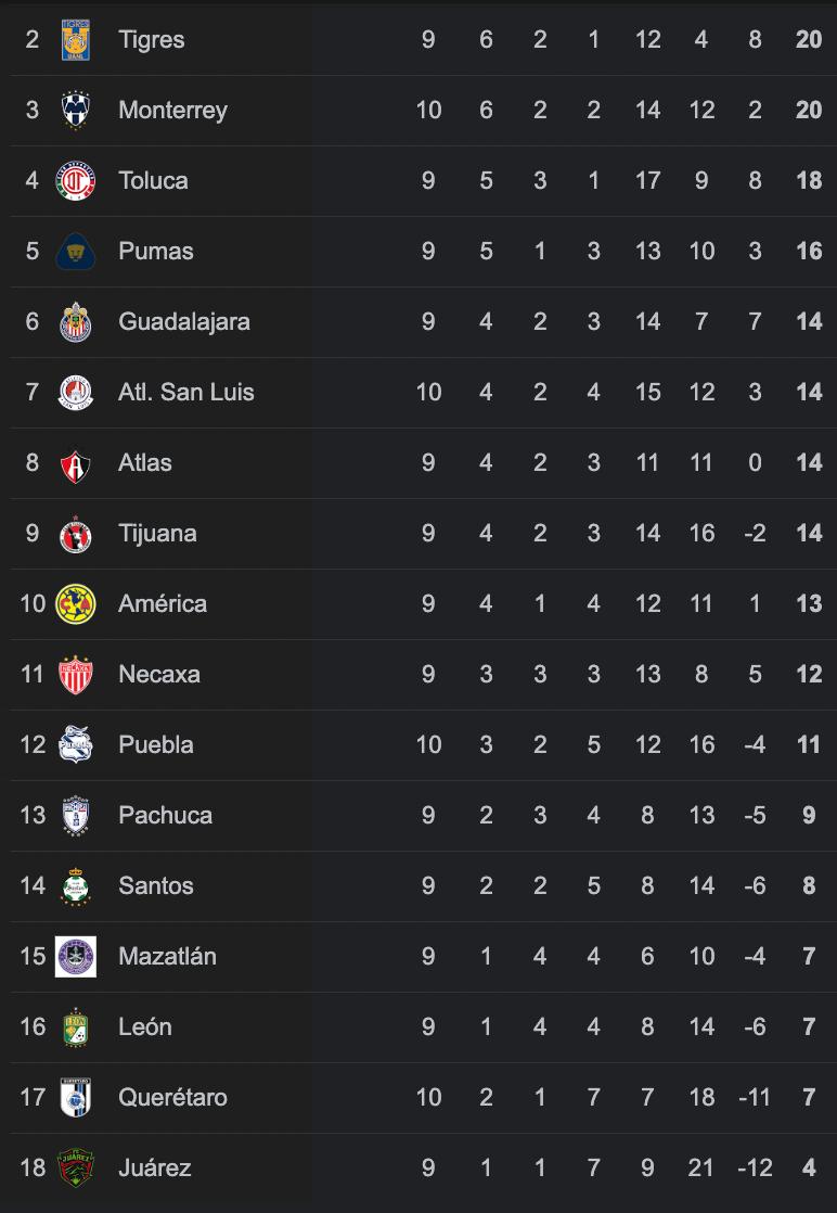 Tras el resultado, los dirigidos por Martín Demichelis son líderes momentáneos al llegar a 20 puntos, esperando lo que haga Cruz Azul ante Chivas, mientras que los de Víctor Manuel Vucetich en el lugar 14 con siete unidades.