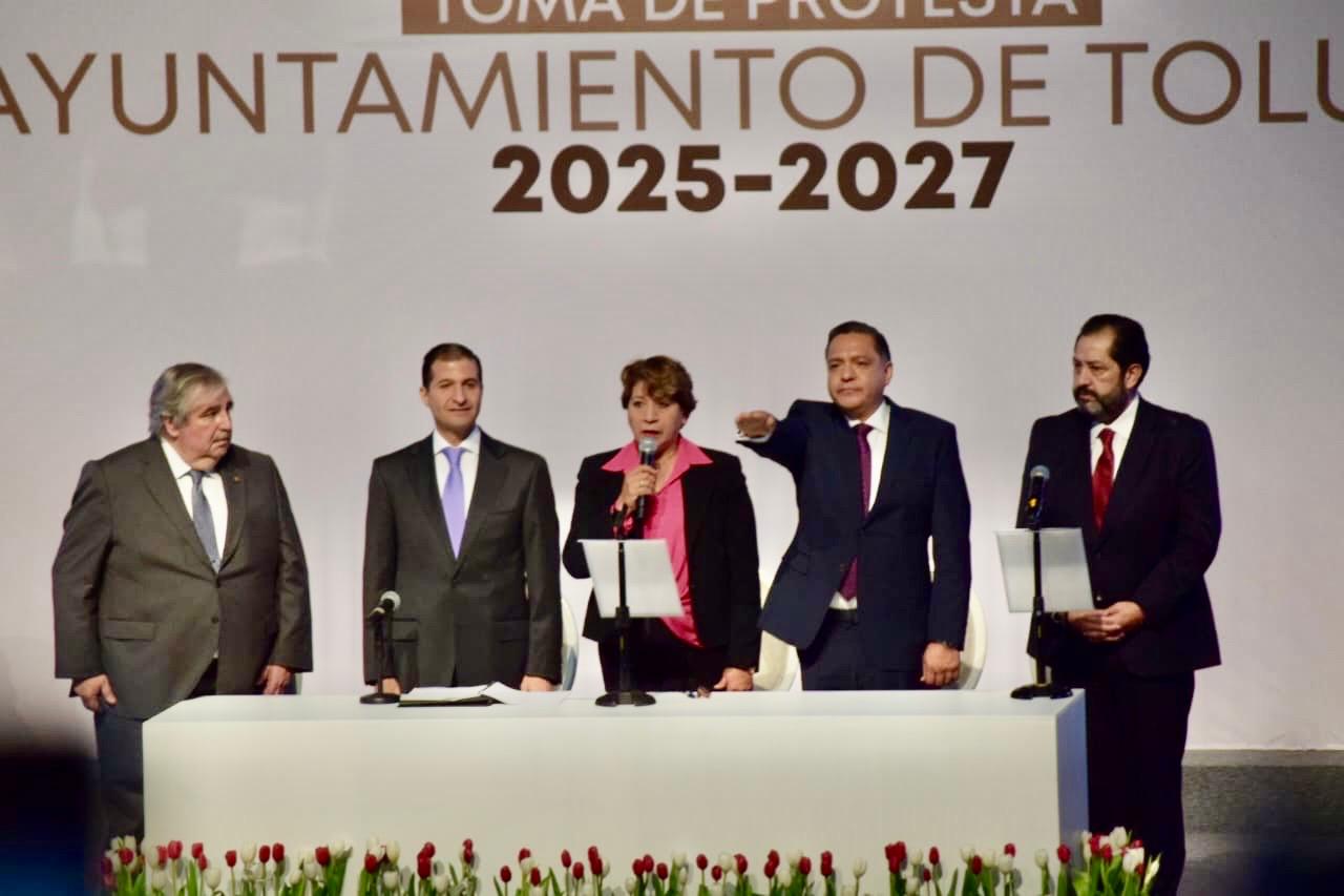 Del fotógrafo JAIME ARRIAGA es de la toma de protesta de RICARDO MORENO como presidente municipal de Toluca, en un evento en el que estuvo acompañado de la gobernadora mexiquense DELFINA GÓMEZ ÁLVAREZ, quien comentó que la capital mexiquense volverá a ser “Toluca la Bella” con unidad y trabajo, pues en equipo se atenderá el rezago en servicios y necesidades de sus habitantes, por lo que exhortó al próximo alcalde a actuar con compromiso, transparencia y responsabilidad poniendo en el centro de las decisiones la voz de la ciudadanía.