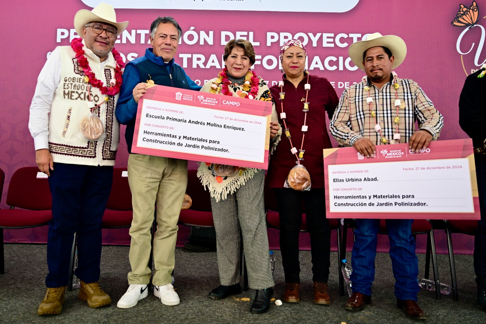 En este evento, la gobernadora Delfina Gómez entregó herramientas y materiales para la construcción de jardines polinizadores, como árboles frutales, plantas, mochilas aspersoras, carretillas, malla aspersora, sistema de captación de agua, fertilizante orgánico, microtunel y demás herramientas para la labor.