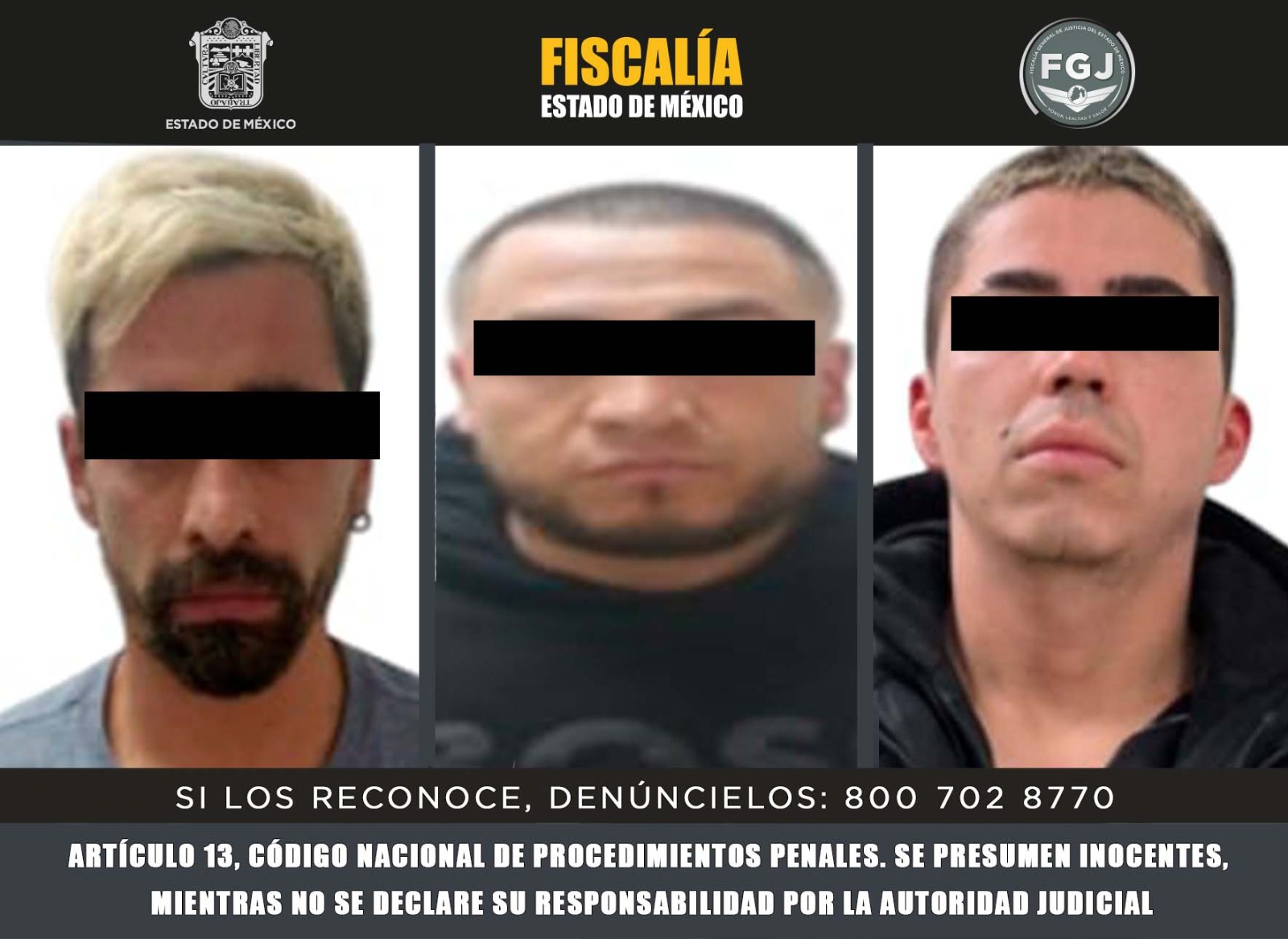 La Fiscalía General de Justicia del Estado de México pone a disposición de la ciudadanía el correo electrónico [email protected], el número telefónico 800 7028770, o bien, la aplicación FGJEdomex, la cual está disponible de manera gratuita para los teléfonos inteligentes de los sistemas iOS y Android, para que denuncie cualquier hecho delictivo.