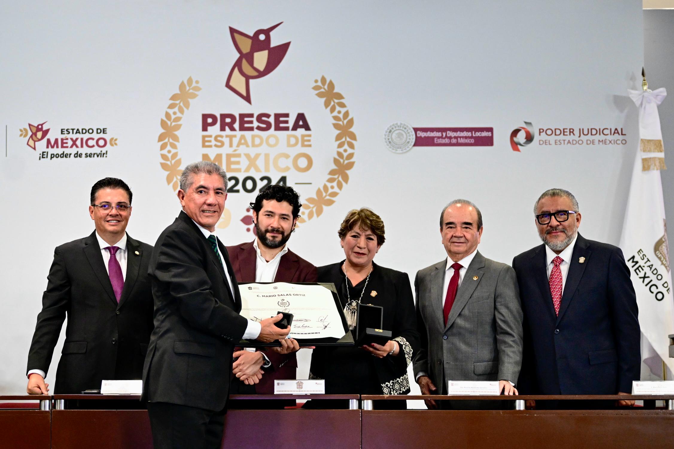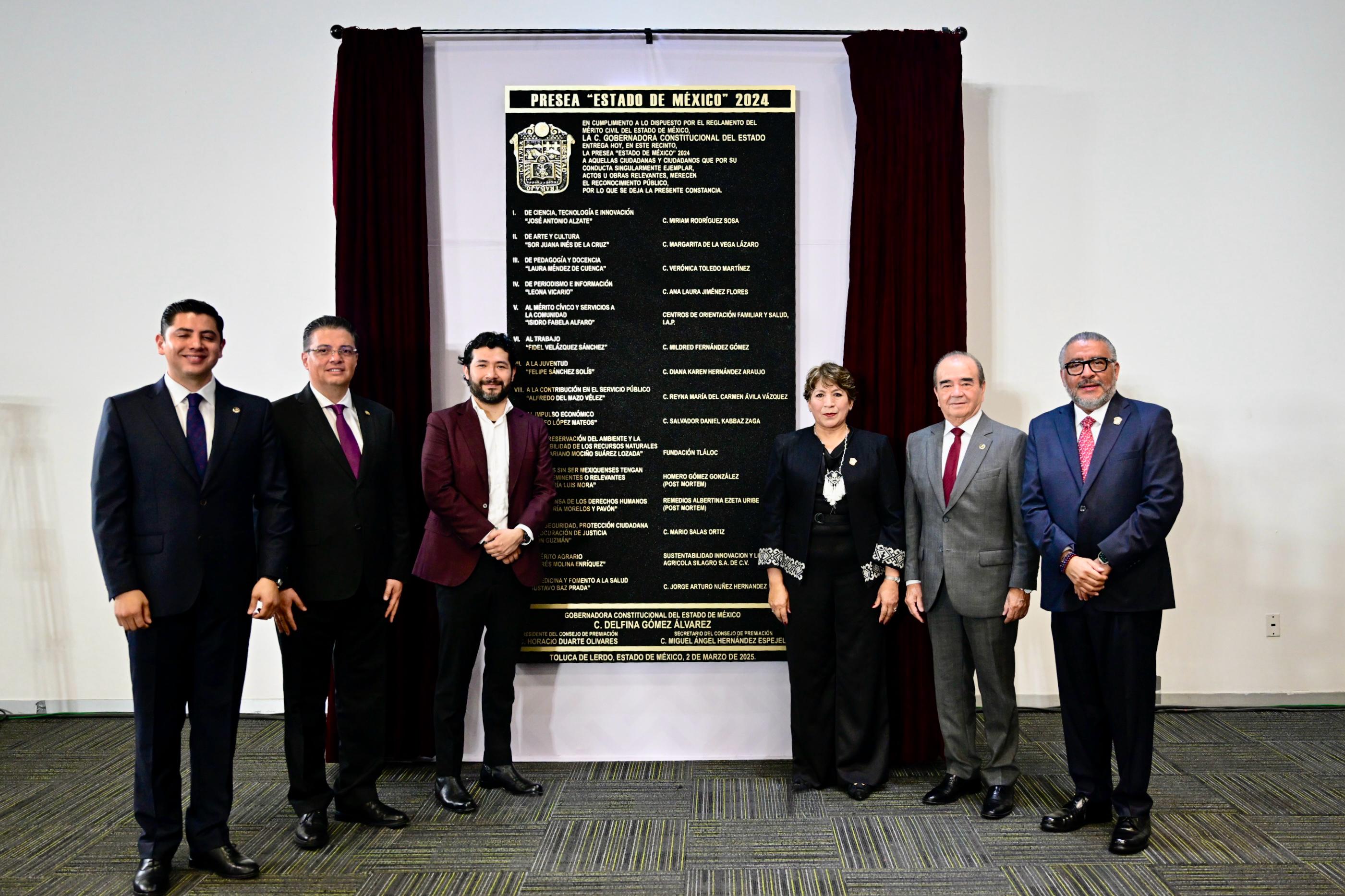 En esta ceremonia, la gobernadora hizo entrega de la presea Estado de México 2024: a la Dra. Miriam Rodríguez Sosa, De Ciencia, Tecnología e Innovación “José Antonio Alzate”; Mtra. Margarita de la Vega Lázaro, De Arte y Cultura “Sor Juana Inés de la Cruz”; Mtra. Verónica Toledo Martínez, De Pedagogía y Docencia “Laura Méndez de Cuenca”; Lic. Ana Laura Jiménez Flores, De Periodismo e Información “Leona Vicario”; Centros de Orientación Familiar y Salud, I.A.P., Al Mérito Cívico y Servicios a la Comunidad “Isidro Fabela Alfaro”; Lic. Mildred Fernández Gómez, Al Trabajo “Fidel Velázquez Sánchez”; C. Diana Karen Hernández Araujo, A la Juventud “Felipe Sánchez Solís”; Mtra. Reyna María del Carmen Ávila Vázquez, A la Contribución en el Servicio Público “Alfredo del Mazo Vélez”; Arq. Salvador Daniel Kabbaz Zaga, Al Impulso Económico “Adolfo López Mateos”; Fundación Tláloc, De la Preservación del Ambiente y la Sostenibilidad de los Recursos Naturales “José Mariano Mociño Suárez Lozada”; Homero Gómez González (Post Mortem), A Quienes sin ser Mexiquenses Tengan Méritos Eminentes o Relevantes “José María Luis Mora”; Lic. Remedios Albertina Ezeta Uribe (Post Mortem), A la Defensa de los Derechos Humanos “José María Morelos y Pavón”; Mtro. Mario Salas Ortiz, De la Seguridad, Protección Ciudadana o Procuración de Justicia “León Guzmán”; Sustentabilidad Innovación y Liderazgo Agrícola SILAGRO S.A. de C.V., Al Mérito Agrario “Andrés Molina Enríquez”; Dr. Jorge Arturo Núñez Hernández, De Medicina y Fomento a la Salud “Gustavo Baz Prada”.