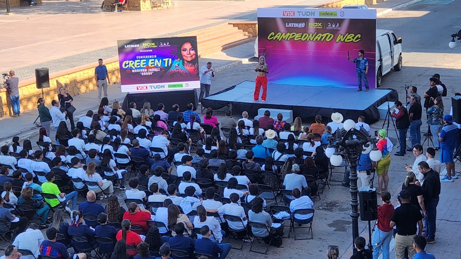 Guaymas, Sonora.- En una emotiva jornada marcada por la inspiración y el empoderamiento, la tetracampeona mundial de boxeo, Mariana “La Barby” Juárez, ofreció su conferencia “Cree en ti” en el Palacio Municipal de Guaymas, donde compartió con vecinos de la comunidad las experiencias que la han convertido en una de las figuras más icónicas del deporte mexicano.
