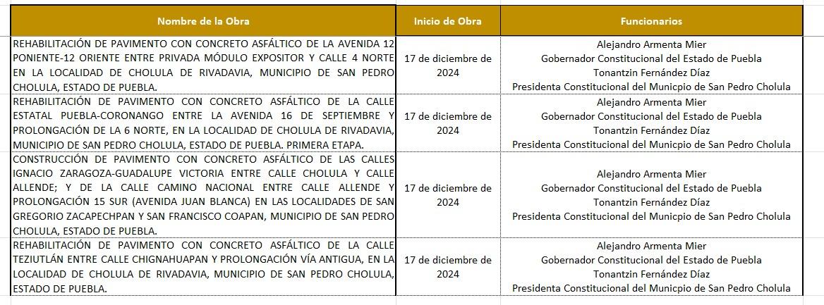 A mediados de diciembre del año pasado, la presidenta municipal de San Pedro Cholula, Tonantzin Fernández y el gobernador Alejandro Armenta Mier, iniciaron cuatro obras conjuntas muy importantes de construcción y rehabilitación de pavimento en las avenidas 12 poniente y oriente, 16 de Septiembre y prolongación 6 norte, entre otras.