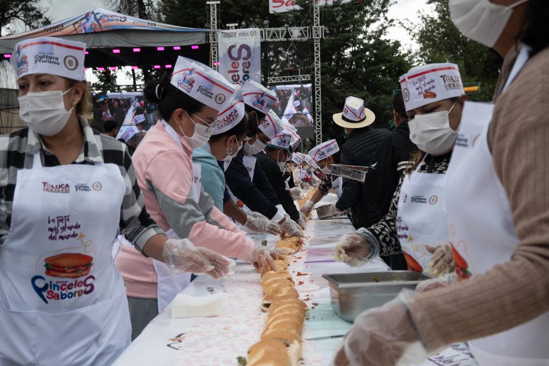 Victoria Sánchez, Directora General de Educación, Cultura y Turismo, destacó que la elaboración del chorizo fue realizada por seis maestras y maestros del municipio; además, detalló que la realización de la torta fue por más de 60 servidores públicos que pusieron 20 kilos de frijoles, 42 de aguacate, 46 de jito-mate, 20 de chiles, 60 litros de crema y pan artesanal de 82 metros, para que los asistentes se deleitaran con el sabor toluqueño.