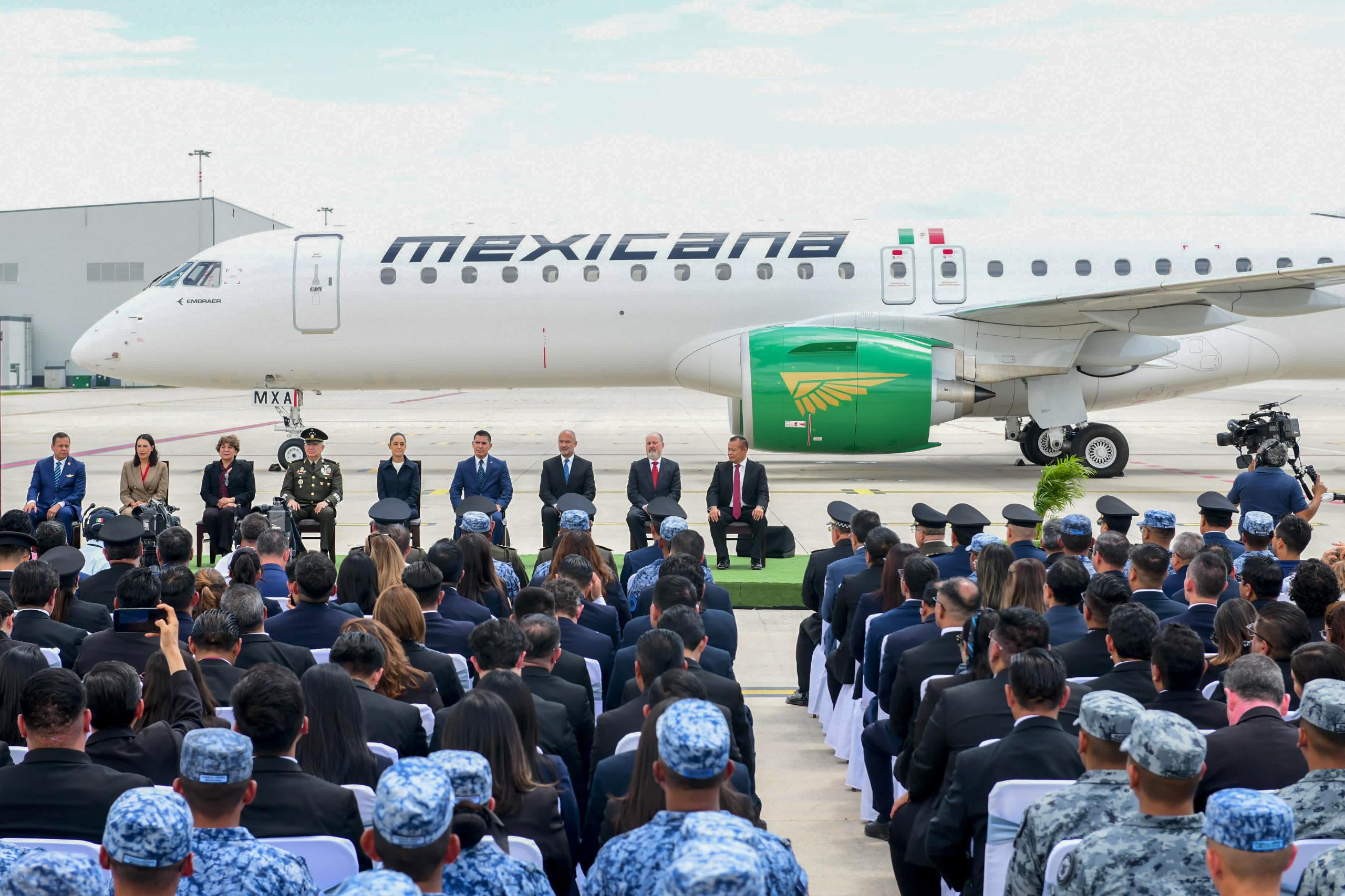 “Esta tarde acompañé a la Presidenta @Claudiashein al @aifaaero, en #Zumpango, donde se dio la bienvenida al nuevo avión Embraer E195-E2 de @MexicanaVuela_, aerolínea que es del pueblo y para el pueblo. Esta aeronave, primera en su tipo para operar en México, ofrece una experiencia moderna, cómoda, pensada en la gente y cuidando el medio ambiente, lo cual representa un paso trascendente hacia la conectividad área de nuestro país estando en armonía con nuestra madre tierra.